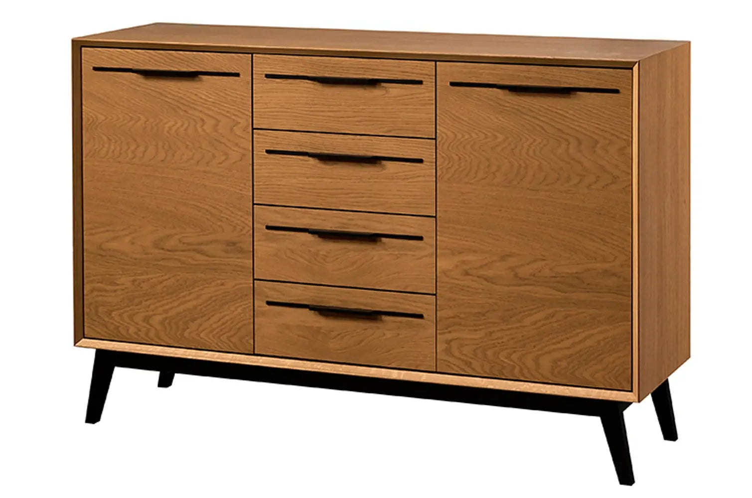 Con dos puertas laterales y cuatro amplios cajones, ofrece un almacenamiento versátil ideal para el salón, dormitorio o recibidor. Su estructura robusta, tiradores metálicos negros y patas de madera maciza subrayan su carácter sólido y refinado.